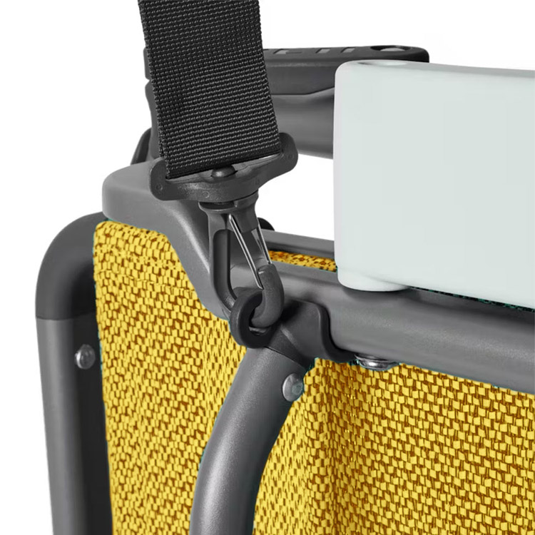 Zawiera trwałą, lekką torbę transportową z paskiem na ramię ułatwiającym transport. Po złożeniu krzesło zachowuje smukły profil, który idealnie pasuje do bagażników samochodowych i schowków.