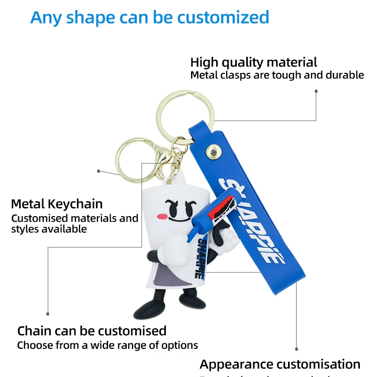Ożyw swoją markę lub pomysł dzięki w pełni dostosowanym projektom 2D lub 3D. Niezależnie od tego, czy jest to logo, maskotka czy slogan, nasze breloki z miękkiego PVC są dopasowane do Twojej wizji dzięki żywym kolorom i dużej szczegółowości.