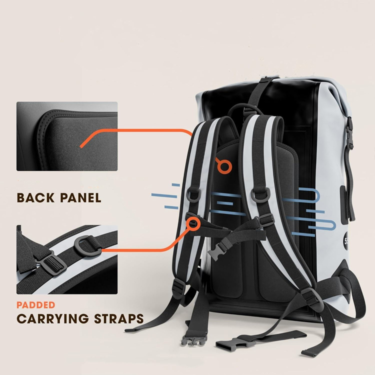 Zawiera wygodny, wyściełany pasek na ramię, wiele uchwytów do noszenia i zewnętrzne paski kompresyjne do bezpiecznego mocowania do plecaków lub jednostek pływających podczas aktywnego ruchu.