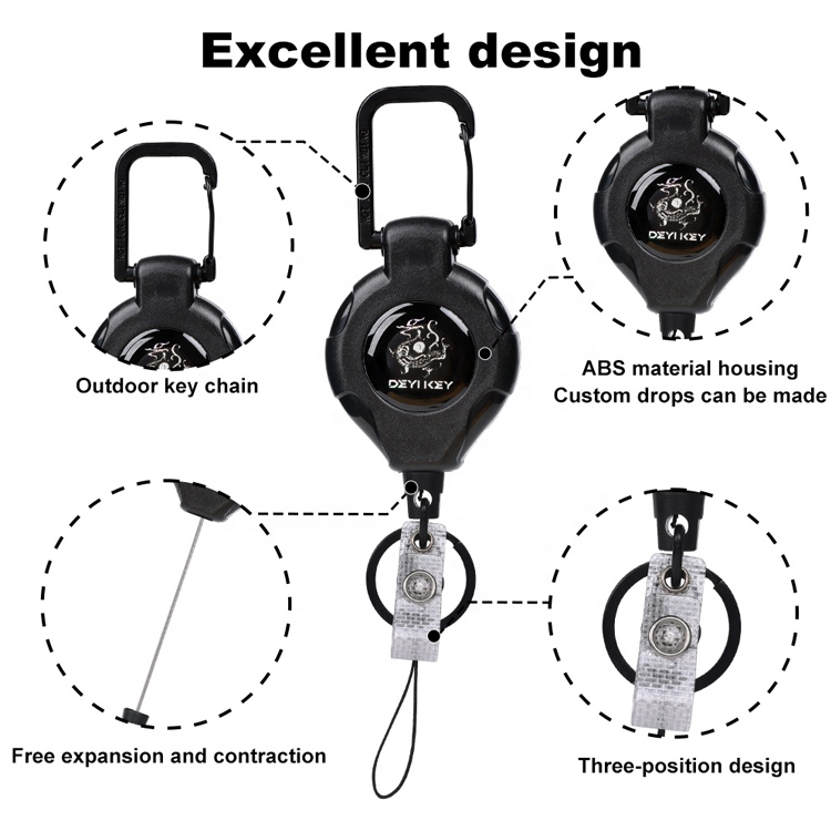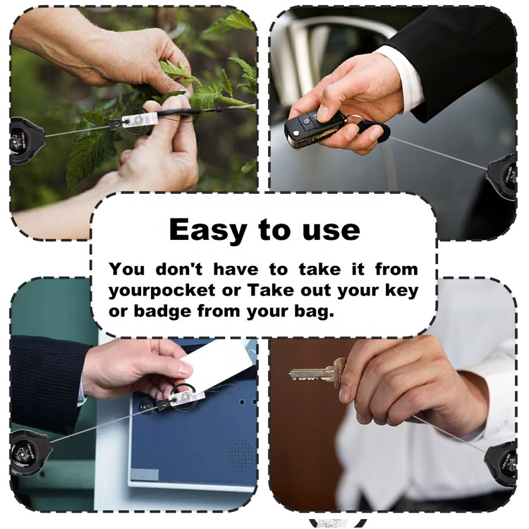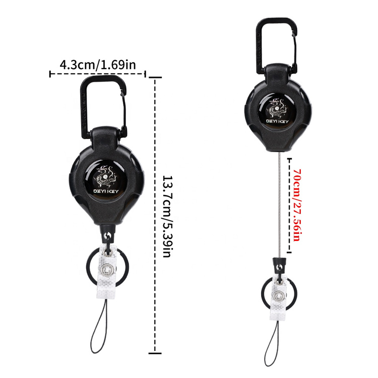 Zawiera trwałą nylonową linę o długości 80 cm z płynnie zwijanym mechanizmem, który umożliwia wygodne rozciąganie, jednocześnie zapobiegając splątaniu, zapewniając bezpieczeństwo i dostępność kluczy podczas zajęć na świeżym powietrzu.