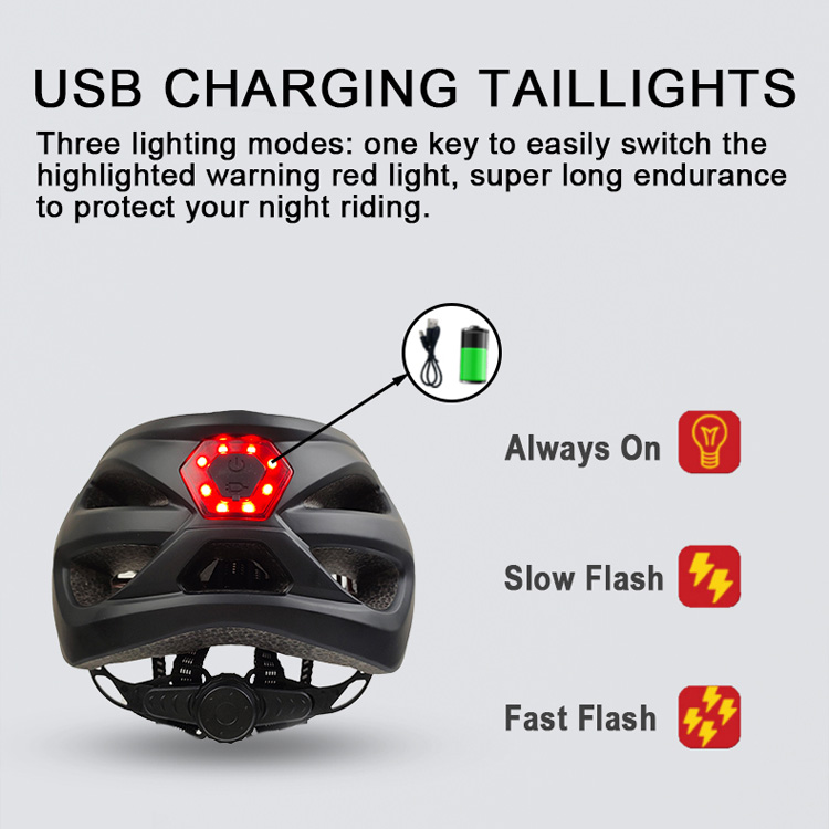 Posiada zarówno przednie, białe, jak i tylne, czerwone, ładowane światła LED z wieloma trybami (ciągłe, migające, stroboskopowe), zapewniające widoczność 360° podczas jazdy nocą. Akumulator ładowany przez USB zapewnia do 6 godzin ciągłej pracy.