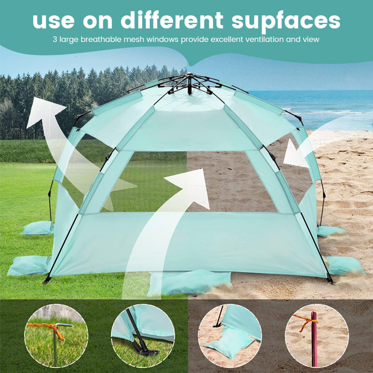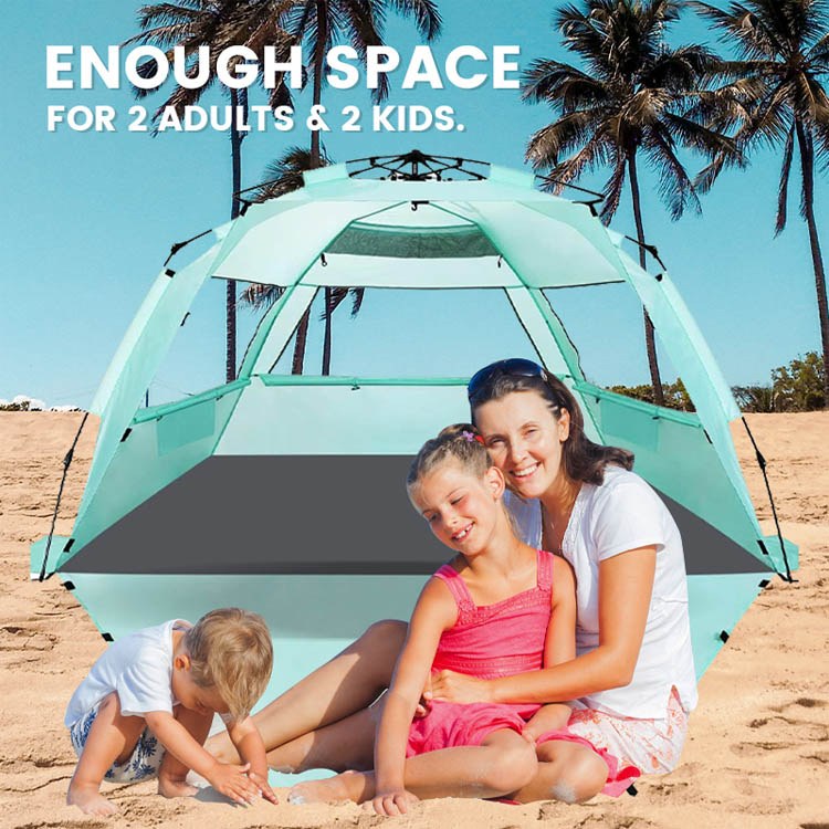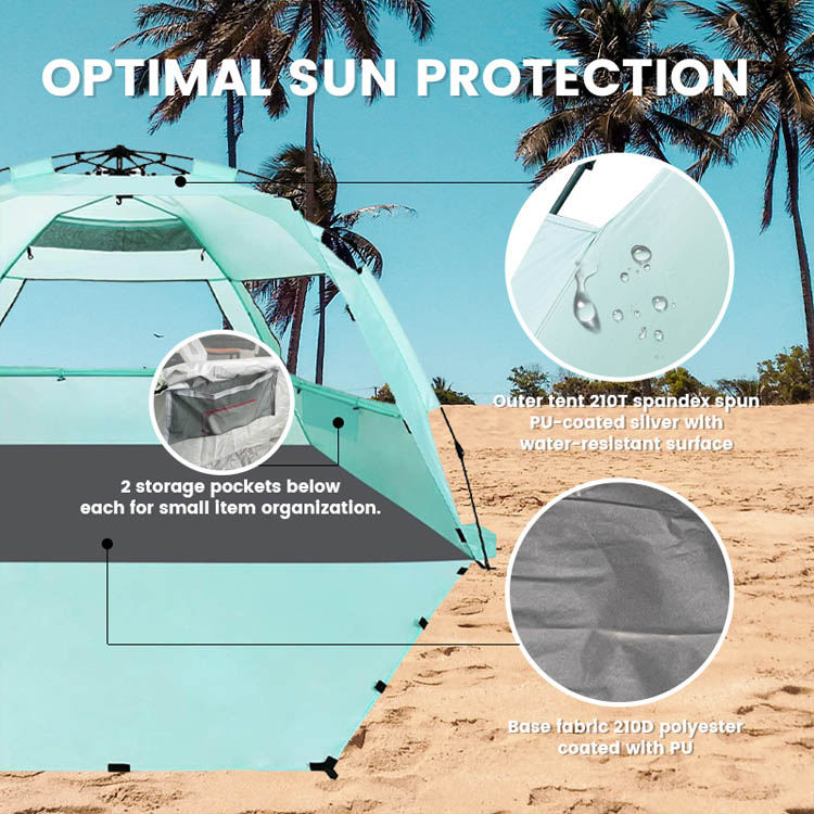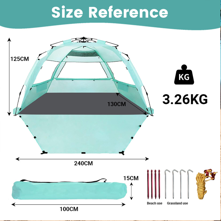 Hurtowy, masowy, ultralekki poliestrowy namiot plażowy z cieniem przeciwsłonecznym. Twoje najlepsze rozwiązanie hurtowe do ochrony przed słońcem na plaży. Ten ultralekki poliestrowy namiot przeciwsłoneczny ma wygodną, składaną konstrukcję. Idealny do masowego użytku na plaży na świeżym powietrzu, łączy w sobie łatwe wdrażanie z niezawodnym pokryciem cienia.